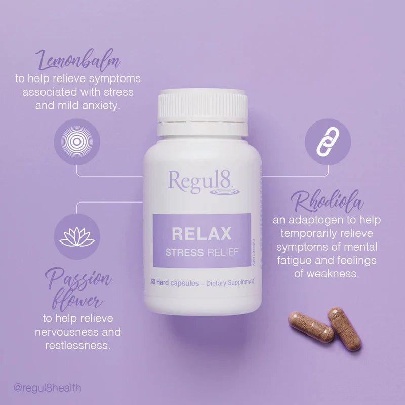 RELAX is designed to help you remain focused and calm, reducing the symptoms of stress during the day, and assisting with a better night's sleep. RELAX contains all-natural ingredients used to help relieve the symptoms associated with mild anxiety and feelings of weakness in healthy individuals. Based on traditional western herbal medicine, RELAX supports physical and mental functioning, whilst aiding in the maintenance of a healthy digestive system.