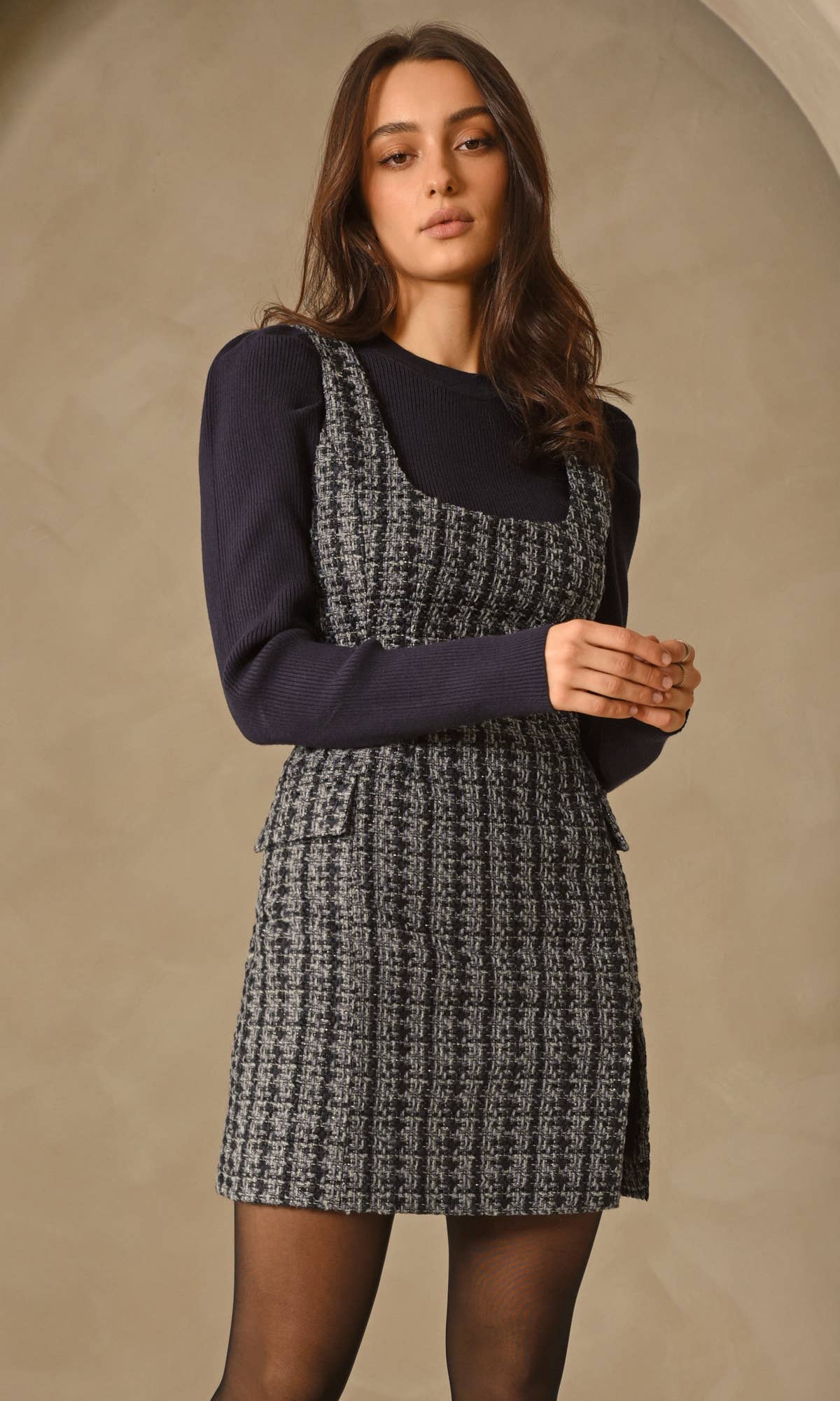 Sleeveless mini dress rendered in a navy hue. The silhouette features a square neckline and a side slit.
